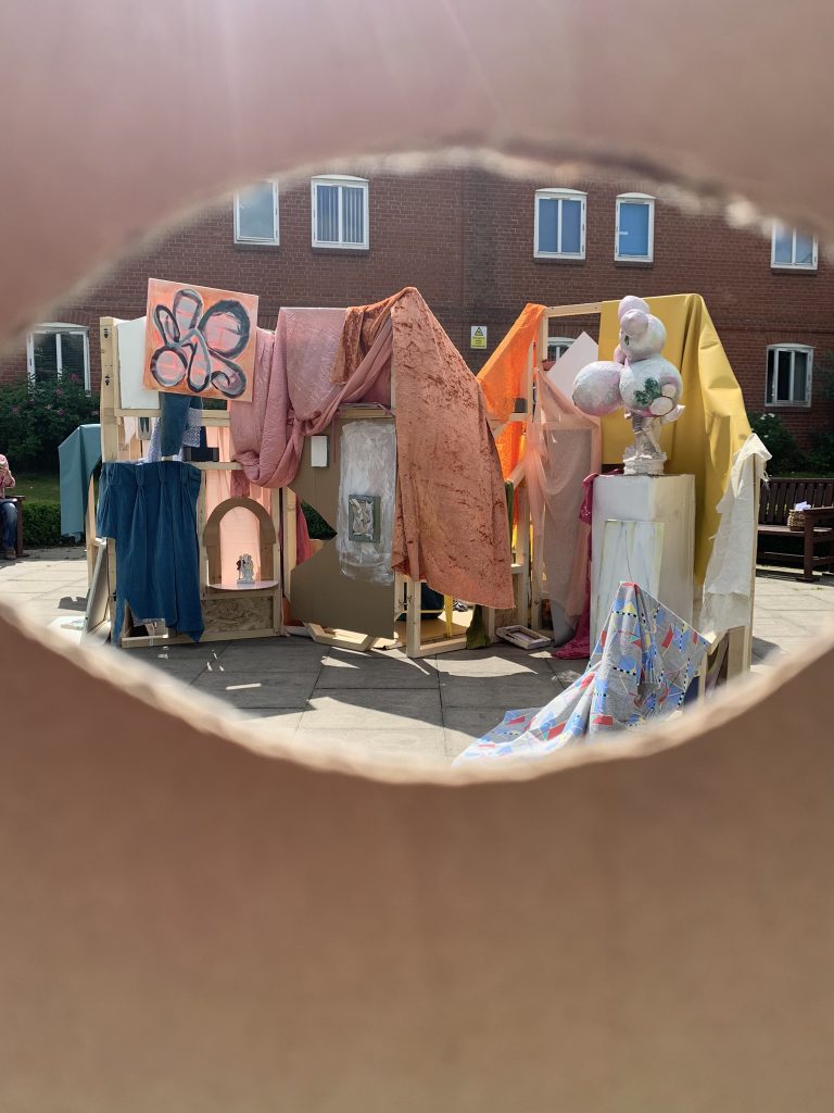 The artwork takes the form of folding wooden frames, akin to a Japanese room divider or Victorian dressing screen, presenting arrangements of paintings, collages, draped fabrics and sculptural objects alongside a bespoke soundscape. Each showing including performances with live painting, further arranging and re-arranging of objects and audience interaction. The sounds and visuals constantly shifted both during and in-between events, responding to the context of the site, the opportunities or limitations of the space available and the audiences’ reactions.