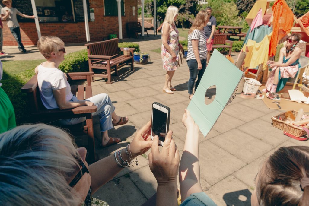 The function of the Intermission frames connects to a number of themes within Jayne’s solo practice: large-scale structures for viewing her paintings, along with many fragmented, interchangeable artworks, which come together in fleeting moments to connect and complete each other. The viewing of the work was extended by small, hand-held looking devices, which were given out to audiences during the performances.  We furthered the interactive experience of the show through multi-layered soundscapes experienced simultaneously through Bluetooth speakers and headsets – channels could be switched remotely by the artist and also manually by the audience.