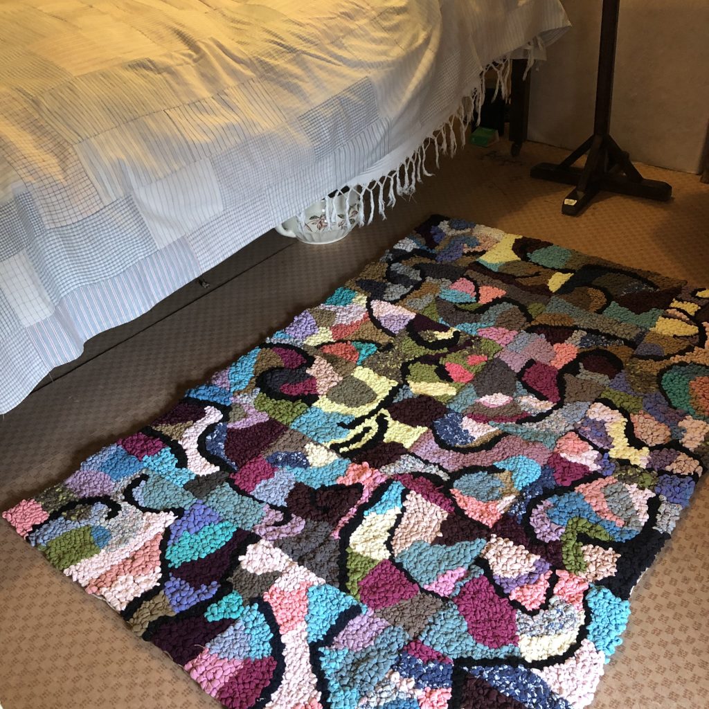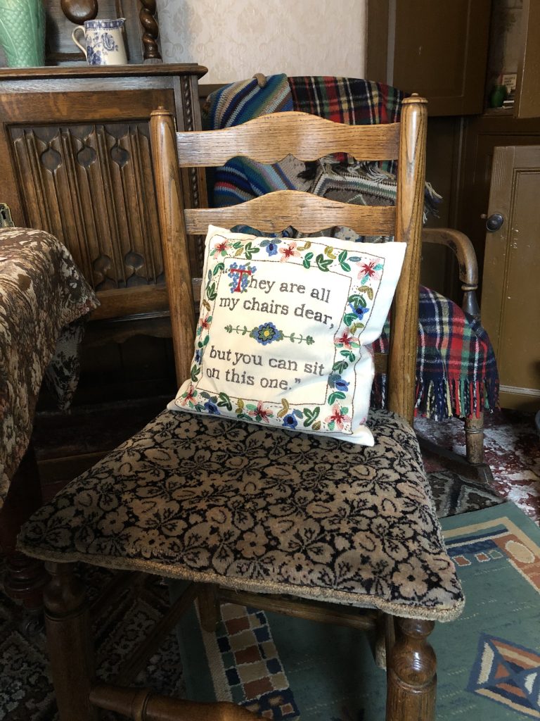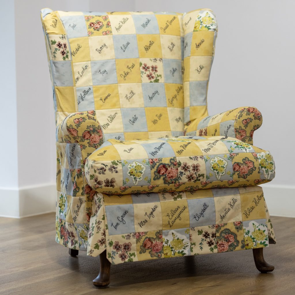 Larger-scale community projects included the Community Rug and Friendship Chair, which involved many local people contributing their handskills. These projects suited pandemic conditions since they were provided in pack form and then constructed by Nicki. The Friendship Chair patchwork was created in collaboration with Hannah & Nails, and covers a donated mid-century armchair, with digitally-printed fabric inspired by wallpaper fragments from the cottage, embroidered names from Mrs Smith’s Diary and decorative additions by Sleaford Embroiderers group.