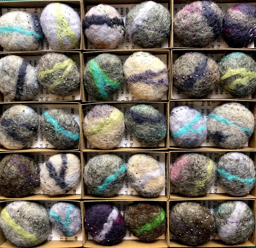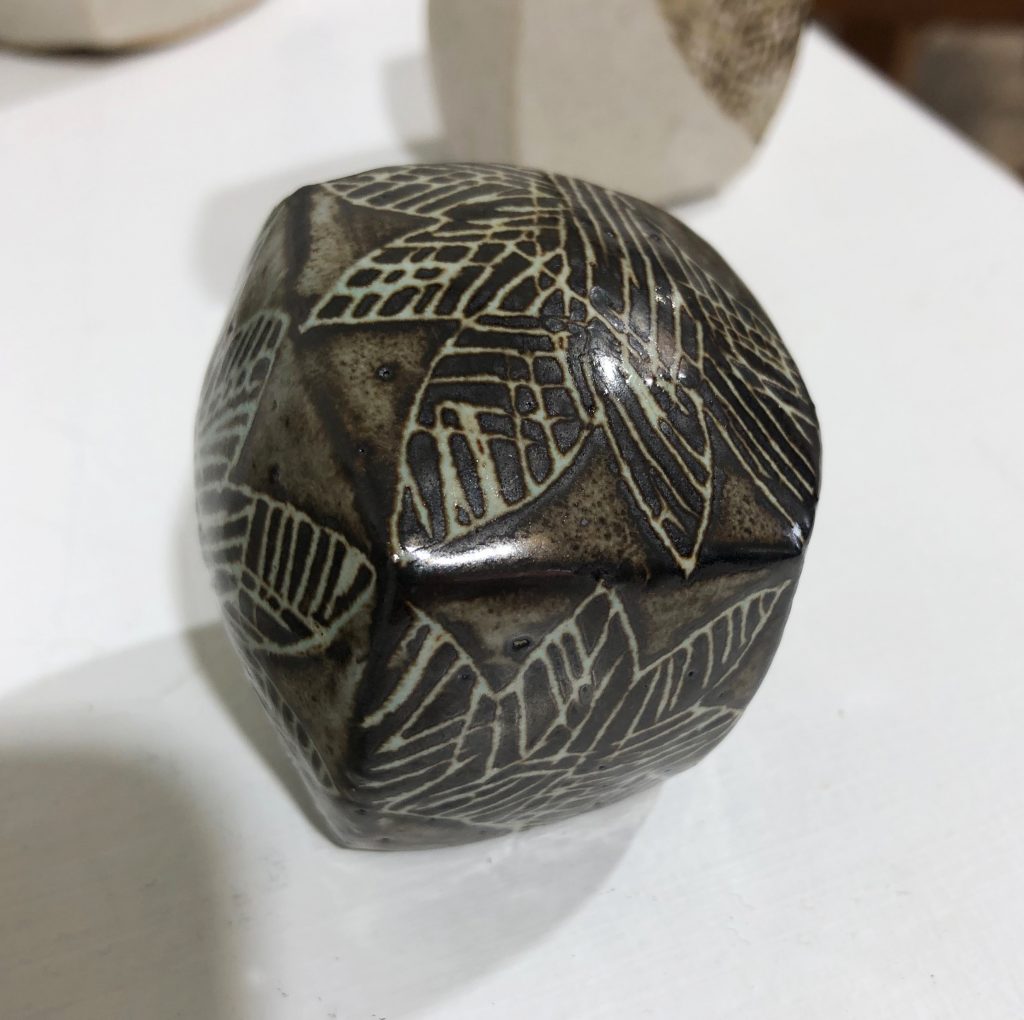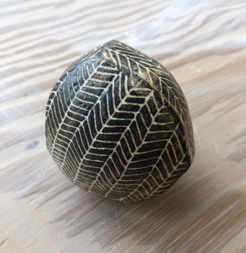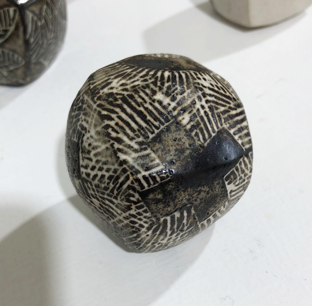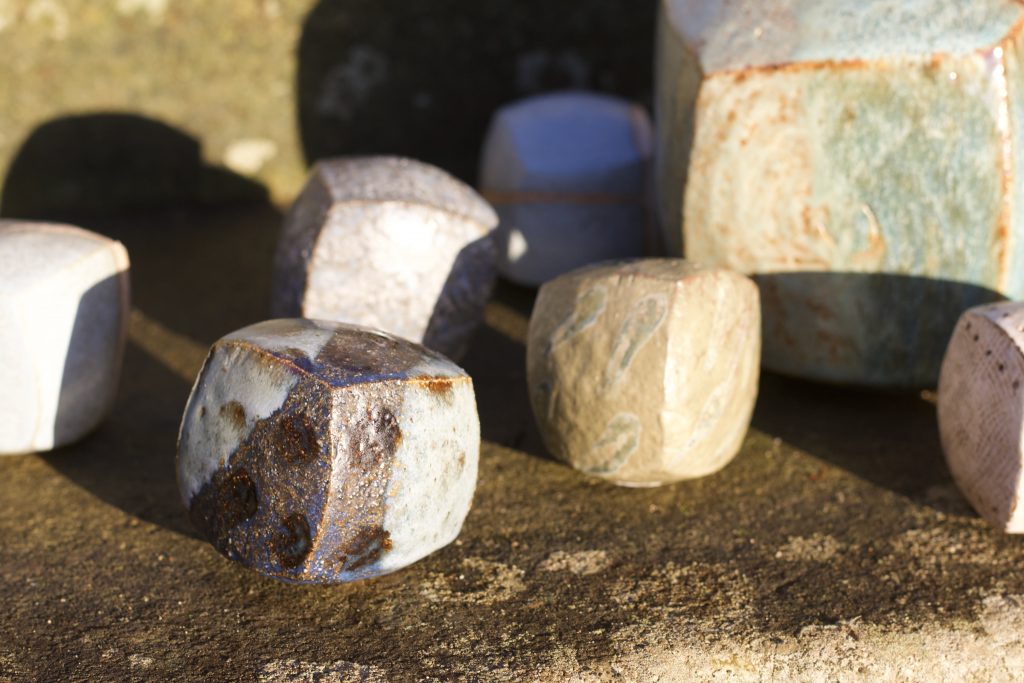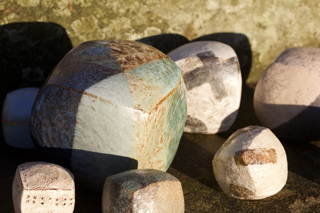Recent ceramic work explores the possibilities of handbuilt cubes, inspired by the first principles of quilt construction, with thinly pinched walls creating objects which appear solid but are fragile and light. The gently curving forms invite handling, and as many of them contain ceramic beads, their unexpected rattle is a sensory surprise.