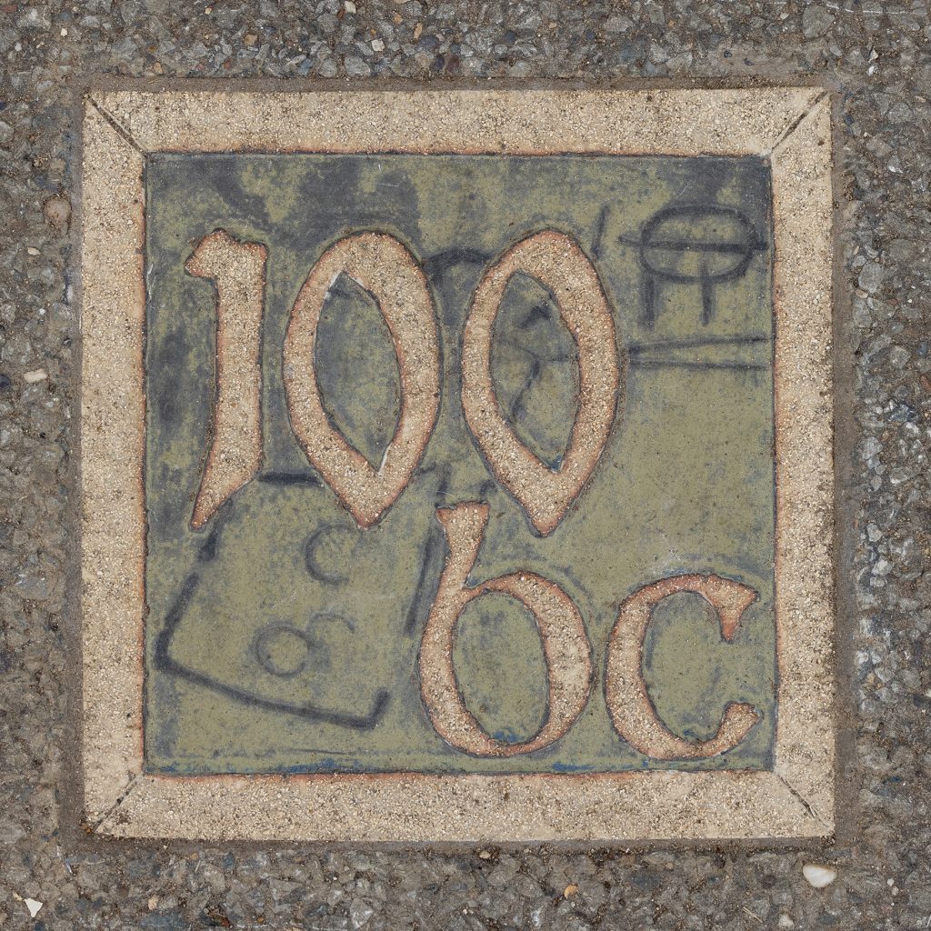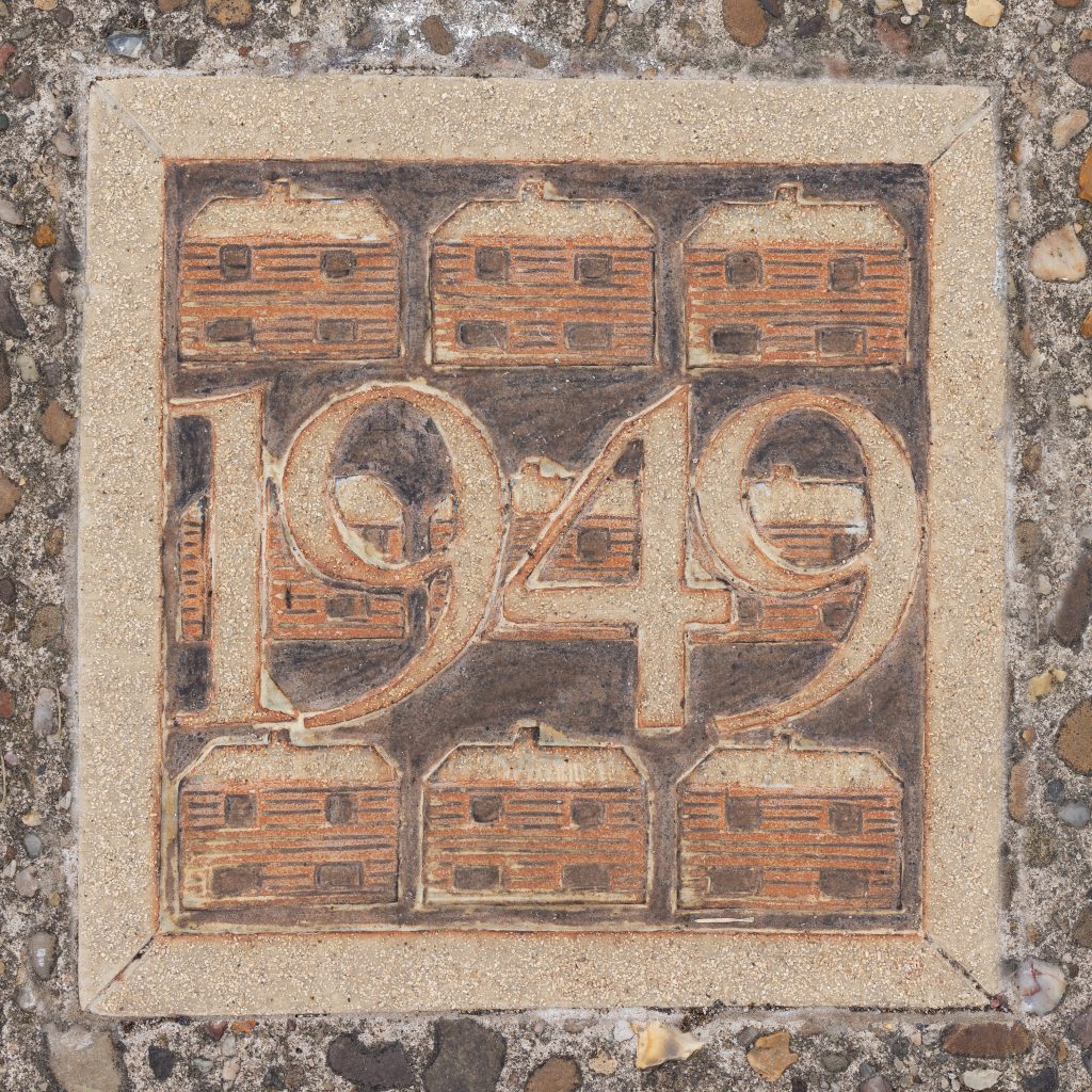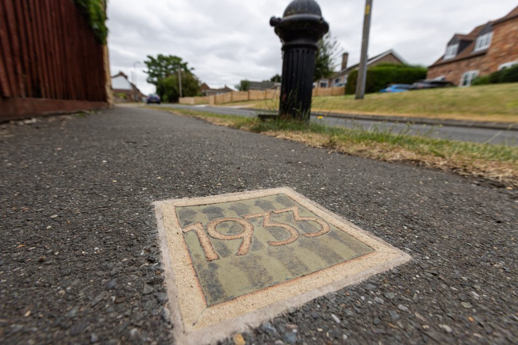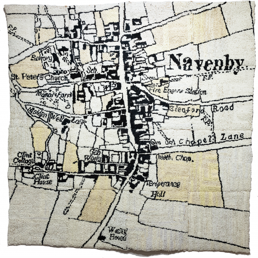 Nicki was invited to create a Navenby Heritage Trail booklet to complement the district’s Ridges & Furrows trail series. The fifteen ceramic Navenby Datestones were conceived as way markers for the trail, conveying village history from the Iron Age onwards. This ambitious project required liaison with Lincolnshire County Council Highways as well as District and Parish Councils. A series of community workshops involved people aged 5-92 in contributing to a ceramic tile panel installed on an external wall of the community centre. The Navenby Map Rug was created in conjunction with the Trail, using Mrs Smith’s favourite rug-hooking technique to replicate the OS Map c1906.