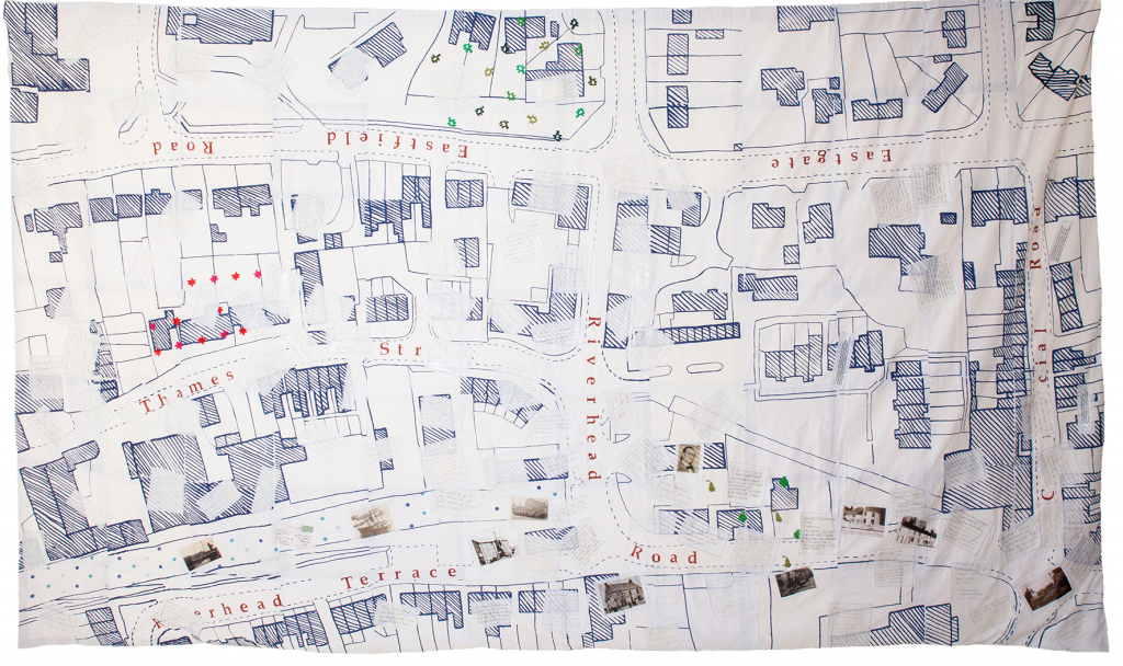 Transforming her terraced house into a workspace, Nicki created largescale screen-printed and embroidered fabric patchwork maps (using contemporary OS mapping data) to act as inspirational place-markers. In a series of workshops and then a week-long exhibition based at the historic Navigation Warehouse, she involved local people in adding their personal reflections to the maps and stitching embroidered name labels, both their own names and those from Victorian census returns. The project inspired significant participation and press interest, with overseas contributors, surprise reconnections and people making return visits with friends and family.